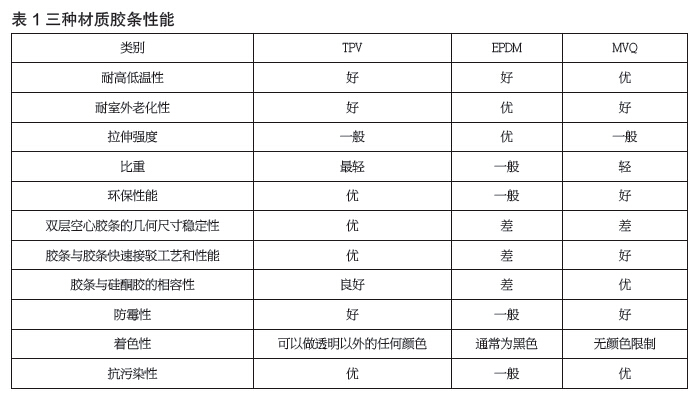 三種材質(zhì)的膠條性能對(duì)比如表1。