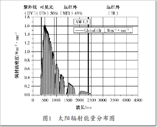 如圖1所示,太陽輻射主要集中在可見光部分(380~780nm),波長大于可見光的紅外線(>780nm)和小于可見光的紫外線(<380nm)的部分較少。在全部輻射能中,波長在150~4000nm的占99%以上,且主要分布在可見光區和紅外區,前者占太陽輻射總能量的約50%,后者占約43%,紫外區的太陽輻射能很少,只占總量的約7%。