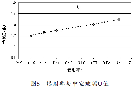 圖5是以4 mm Low-E玻璃+12 mm間隔框充90%氬氣+4 mm白玻的Low-E中空系統的Ug值與輻射率關系的實測圖: