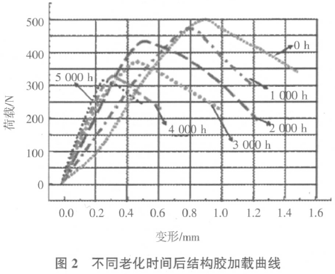 在結(jié)構(gòu)膠失效因素中,結(jié)構(gòu)膠老化是最主要的因素。結(jié)構(gòu)膠在使用過程中,受到環(huán)境中的光、熱、氧(臭氧)以及各種介質(zhì)和微生物等多種因素的影響與作用,其粘結(jié)性能會(huì)逐漸下降,甚至被破壞,在潮濕、腐蝕介質(zhì)及陽(yáng)光直射等環(huán)境中更是如此,特別是當(dāng)濕度≥95%,溫度高于50~60 °C 時(shí),水分會(huì)成為影響粘接界面強(qiáng)度的元兇。因?yàn)椋軡B入粘接層內(nèi)部,而且侵蝕粘接界面比侵入結(jié)構(gòu)膠本體快,其過程是水從粘接界面邊緣滲入并逐漸向膠體中心區(qū)域擴(kuò)展,隨著時(shí)間的推移,滲入粘接界面內(nèi)的水量會(huì)越來越多,從而降低結(jié)構(gòu)膠與被粘接物表面的吸附力,造成結(jié)構(gòu)膠粘結(jié)性能下降和使用壽命縮短;滲入膠體的水還會(huì)使結(jié)構(gòu)膠本身產(chǎn)生溶脹,降低膠體的物理性能。目前,評(píng)價(jià)結(jié)構(gòu)膠的耐老化性能主要采用人工加速老化實(shí)驗(yàn)。比如,ETAG 002《結(jié)構(gòu)密封膠玻璃裝配系統(tǒng)技術(shù)審核指南》要求:密封膠在浸水-紫外線輻射、鹽霧、酸霧、清潔劑浸泡4 項(xiàng)加速老化后,結(jié)構(gòu)膠的拉伸強(qiáng)度不得低于其初始強(qiáng)度的75%,與基材(詞條“基材”由行業(yè)大百科提供)的粘結(jié)破壞面積不大于10%。將結(jié)構(gòu)膠放入高溫高濕環(huán)境(濕度≥95%,溫度在25~55 °C 之間有規(guī)律的循環(huán)變化)進(jìn)行人工加速老化,并對(duì)不同老化時(shí)間的結(jié)構(gòu)膠進(jìn)行加載獲得變形與載荷曲線圖,見圖2。結(jié)構(gòu)膠加載破壞后的斷面圖,見圖3。