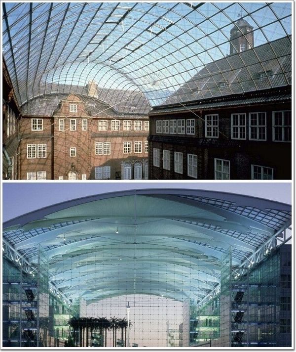 隨著現(xiàn)代鋼材的發(fā)展成熟,由纖細(xì)的金屬框格甚至是金屬索網(wǎng)搭配玻璃組成的玻璃穹頂或者幕墻得以實現(xiàn)。大家最熟悉的例子應(yīng)該是貝聿銘的盧浮宮金字塔。約格·施萊希的大批作品都堪稱是索網(wǎng)玻璃體系的精品,比如上圖中的漢堡城市歷史博物館玻璃屋頂和下圖中的慕尼黑凱賓斯基酒店玻璃幕墻。
