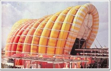 此外,膜材料還為充氣結(jié)構(gòu)的實現(xiàn)提供了絕佳的材料。充氣結(jié)構(gòu)可以分為兩種,第一種是作為主體結(jié)構(gòu)(詞條“主體結(jié)構(gòu)”由行業(yè)大百科提供)的充氣結(jié)構(gòu),比如上圖中川口衛(wèi)設(shè)計的1970年日本大阪世博會上的富士館,就是一個典型的充氣結(jié)構(gòu);日常生活常見的各種商業(yè)活動放置的充氣拱門,也可以看做這樣的充氣結(jié)構(gòu)。第二種則是作為局部結(jié)構(gòu)的充氣結(jié)構(gòu),比如水立方的ETFE膜充氣氣泡外墻。對于水立方追求的這種特殊視覺效果,玻璃、塑料等傳統(tǒng)材料都不太合適,可能只有充氣膜能完美的達(dá)成這種朦朦朧朧的設(shè)計意圖。