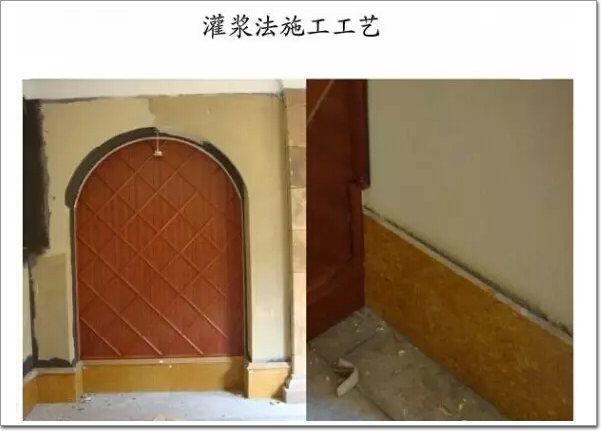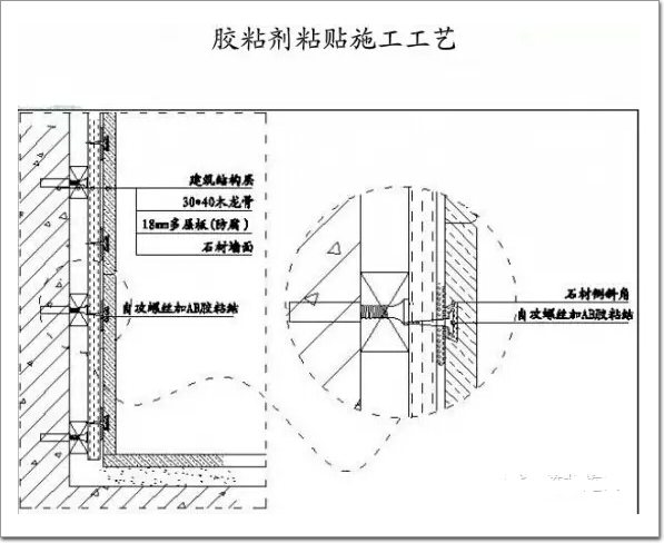 木基層面粘貼石材工藝,適用于小面積、小塊面材料施工范圍(如文化石、裝飾線、踢腳線),須用AB膠結合不銹鋼自攻螺釘粘接固定,石材背面應挖成倒八字型孔,要做好防腐處理。