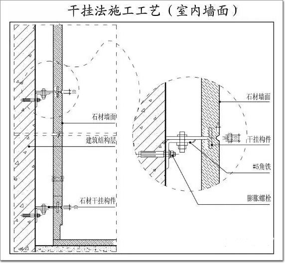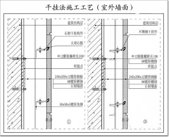 (2)石材厚度要求在20mm以上,2500mm高以內的墻體,豎向需采用5#槽鋼(詞條“槽鋼”由行業(yè)大百科提供),橫向采用40mmx40mm型角鋼,間距根據(jù)石材的橫縫排版確定,2500mm高以上的墻體,豎向需采用8#槽鋼,橫向采50mmx50mm型角鋼,間距根據(jù)石材的恒豐排版確定。