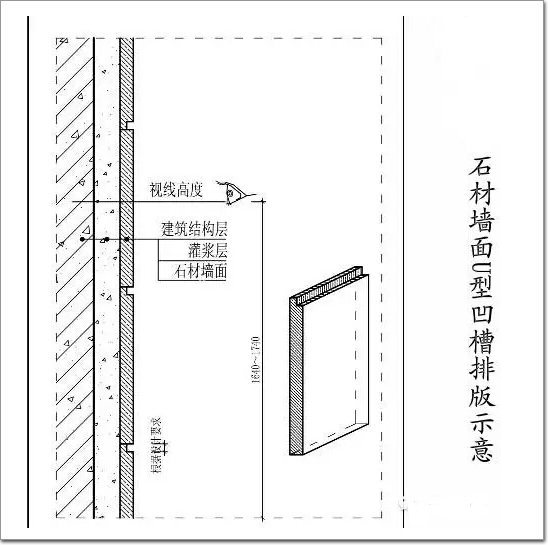 1、石材墻面橫縫,需根據(jù)人體的視線高度排布,施工時需廠家定加工,現(xiàn)場安裝。