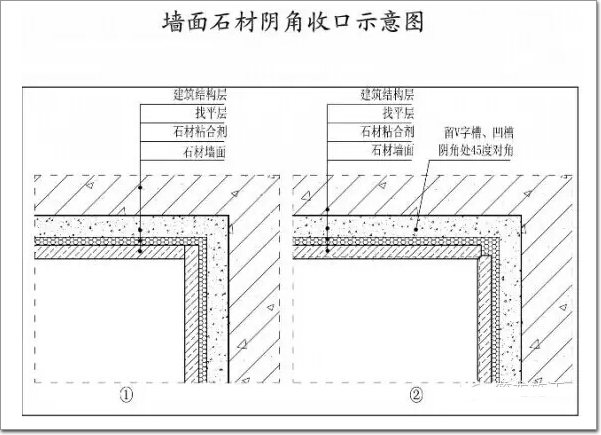3、石材墻面有橫縫時(如V字縫,凹槽)時,陰角收口均需45度(角度稍小于45度,以利于拼接)拼接對角處理,應在工廠內加工完成。