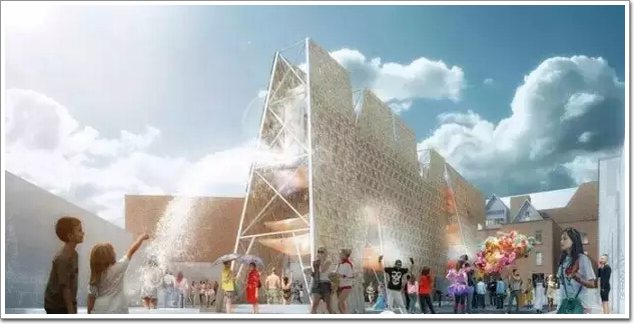 由studio CODA建筑事務所完成的“滑板碎片”幕墻亮相2013年美國現代藝術博物館音樂節,并成為最大的關注對象。整面幕墻都是由滑板木片殘余構成,呈空隙狀分布的幕墻非常適合音樂節這樣的靈動性場所,因為這里聚集著大量的流動游客,這里通常會設有可拆卸的木質桌椅已經為行人提供遮蔭避暑的小型廣場。studio CODA建筑事務所充分發揮他們的奇思妙想,并取材當地進行設計。而正是這樣的設計再一次向世人證明了:任何看似不可能的用材在一個富有創新性建筑師的筆下,都可以成為曠世之作的源泉和靈感。巨大的幕墻下面還設有噴泉池,巨大的泉水穿過幕墻的空隙灑落在人們的身上,增添了一份節日的活躍。