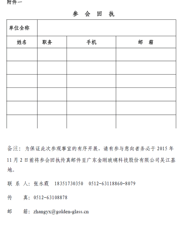 為保證此次參觀事宜的有序開展,請(qǐng)有參與意向者于2015 年11 月2日前將參會(huì)回執(zhí)發(fā)郵件至廣東金剛玻璃科技股份有限公司吳江基地。