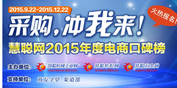 慧聰網2015年度電商口碑榜本著“公開、公正、公平”的活動宗旨,在帆布、紗布、絲網、農業機械、食品機械五個垂直行業展開,活動將通過參與供應商在活動期間產生的交易額、買家下單量、購買買家數及供應商網絡影響力幾方面綜合評分,最終選拔出綜合能力很高的口碑榜獲獎供應商。