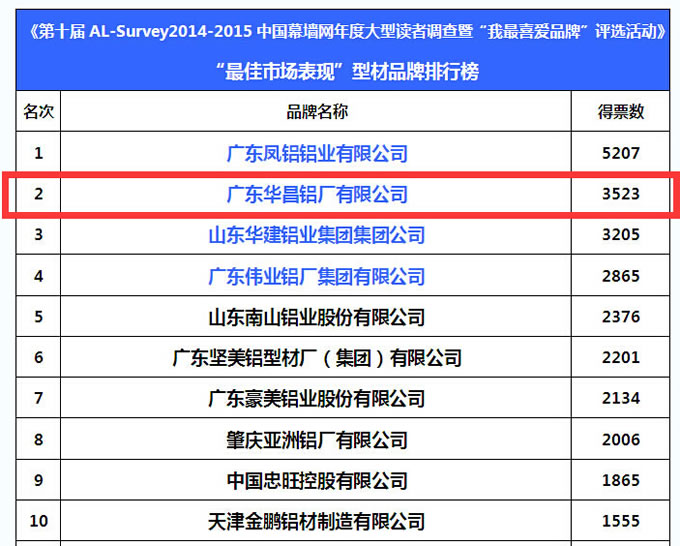 華昌鋁業(yè)自去年11月入圍第十屆AL-Survey門窗幕墻大型讀者調(diào)查活動(dòng)以來,倍受廣大行業(yè)讀者和用戶的青睞,通過三個(gè)多月的網(wǎng)上票選和專家評審:以3523票,榮獲市場表現(xiàn)品牌第2名。