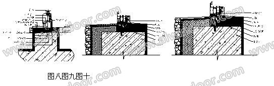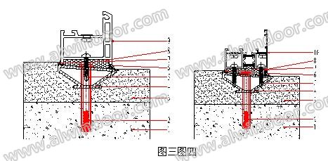 圖四為門窗附框的隔熱保溫(詞條“隔熱保溫”由行業(yè)大百科提供)鋁合金窗安裝剖面圖,先將特殊構(gòu)造的附框4,用金屬膨脹螺栓2固定在建筑預(yù)留的洞口1上,再由建筑進行防水水泥砂漿二次收口裝飾面的濕作業(yè)3,待濕作業(yè)完成后用自攻釘或自攻自鉆螺釘5將鋁合金窗框10的內(nèi)外腔分別固定在特殊構(gòu)造的附框4上,實現(xiàn)有效的連接,在鋁合金窗框10與特殊構(gòu)造的附框4之間填充發(fā)泡膠8,內(nèi)外鋁合金窗框10與室外防水水泥砂漿和室內(nèi)裝飾面用室外密封膠7和室內(nèi)密封膠6進行密封,最終實現(xiàn)門窗框的干法安裝。