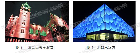 3.雙層表皮內透光的方式。采用空腔內透光照明,既達到了最佳光照效果,節約光能,又可以避免眩光及很好的遮擋燈具。如水立方(圖2),用藍色的LED燈,突出了場館的功能,對其進行了新穎的詮釋。
