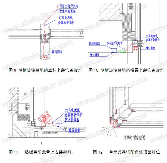 2) 明框框架式玻璃幕墻:燈帶要與幕墻的主受力結構合理連接,燈帶的設置不能破壞幕墻的整體效果,在外立面設計中,可以考慮到將燈帶作為外裝飾的一部分(圖9),橫向和縱向上都是每20m要設置一個出線孔,孔徑大小和所用燈的功率相關(圖10)。燈具固定不能破壞幕墻的水密性。