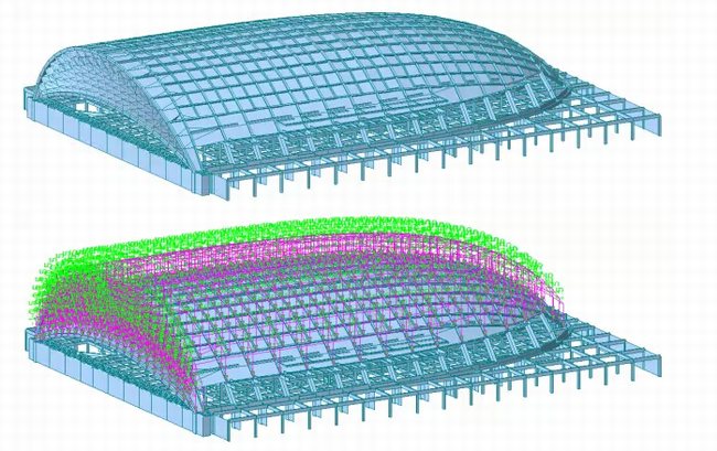 河北奧林匹克體育中心游泳跳水館100米跨采用拱殼鋼結(jié)構(gòu),由于拱殼結(jié)構(gòu)本身的特點,在支座處產(chǎn)生較大的水平推力,從而使下部的支承結(jié)構(gòu)處于承受水平力的不利狀態(tài),為了避免直接傳遞到下部支承結(jié)構(gòu),預(yù)應(yīng)力技術(shù)就是處理這類問題的好辦法,我們在拱架的兩個支承點之間設(shè)置預(yù)應(yīng)力鋼絞線,從而把對支承結(jié)構(gòu)產(chǎn)生的推力轉(zhuǎn)化為由預(yù)應(yīng)力鋼絞線承擔的內(nèi)力,減小變形的作用。本工程在游泳跳水館-1m標高板部分采用有粘結(jié)預(yù)應(yīng)力技術(shù),在2-A/2-M軸中布置8束9孔直線型有粘結(jié)預(yù)應(yīng)力筋,均采用雙端張拉。