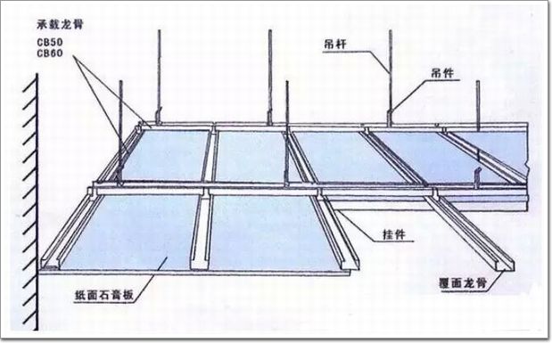 3、暗龍骨吊頂工程的吊桿、龍骨和飾面材料的安裝必須牢固。