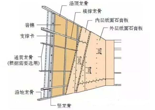 彈線、安裝吊桿、安裝主龍骨、安裝副龍骨、起拱調平、安裝石膏板