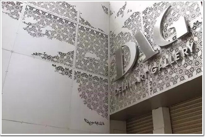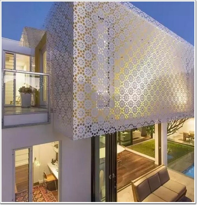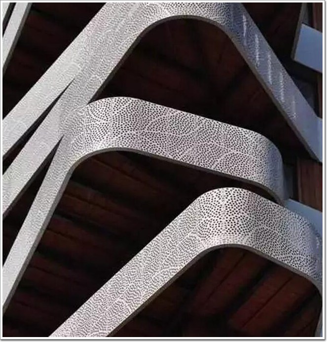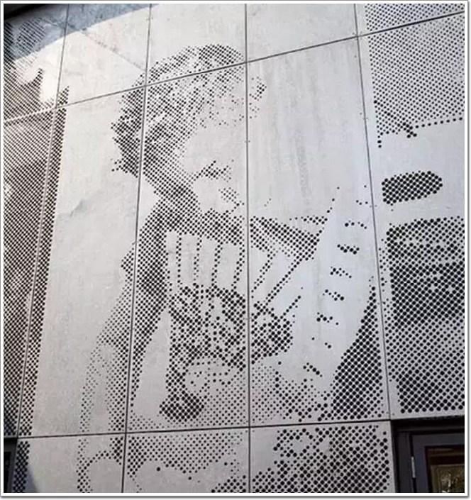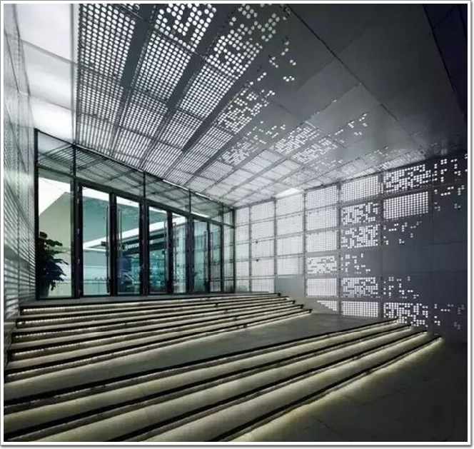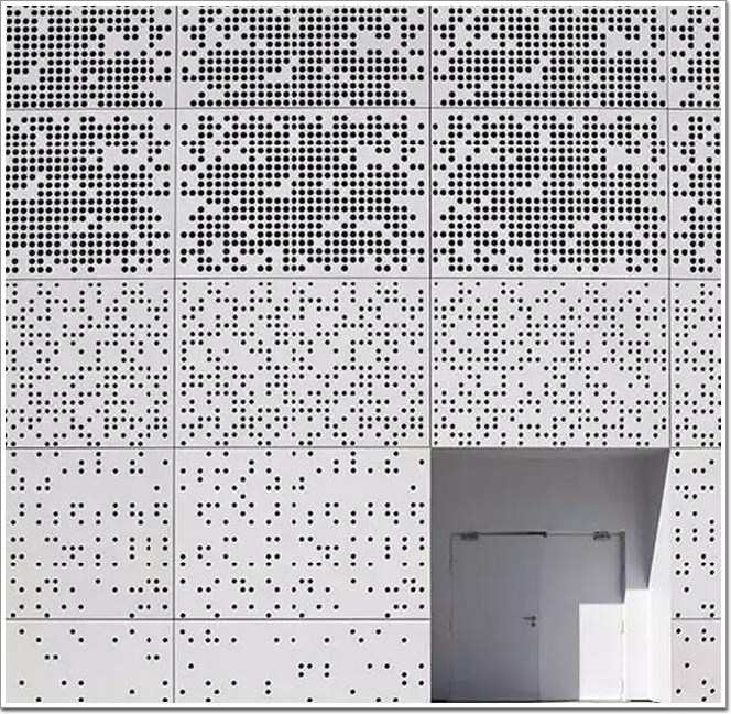 穿孔板由于材質的限制,所以孔型上,基本是圓孔、方孔、三角孔等簡單的幾何圖形。在現代生活中應用得非常廣泛,我們可以在工藝品、音響網罩等物品中看到它的身影。但更多時候它還是運用在建筑上,今天就帶大家一睹穿孔板在建筑中的運用吧~