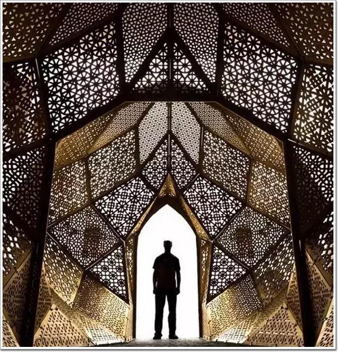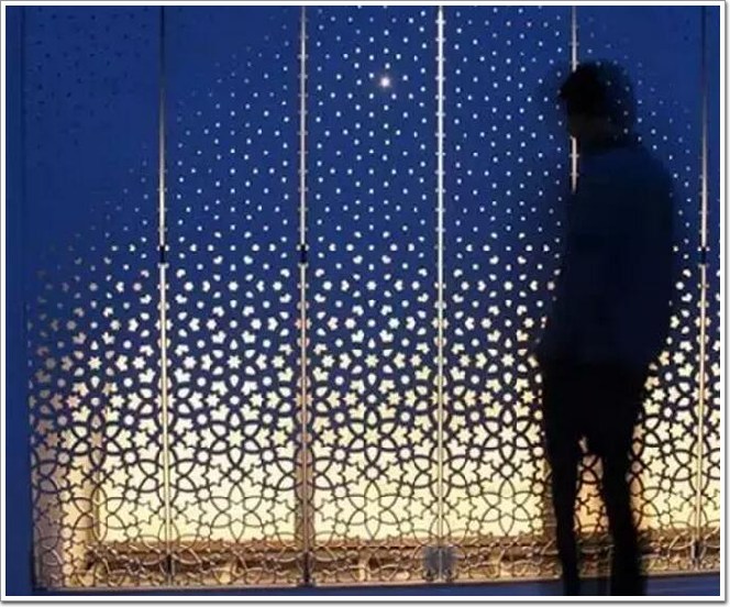 大部分運用還是在室外建筑的外層,不同大小的孔洞,實現肌理效果的變化,富有層次感,并且具有一定的透光性,像一層“面紗”,保證良好采光的同時又透露著些許神秘的氛圍。