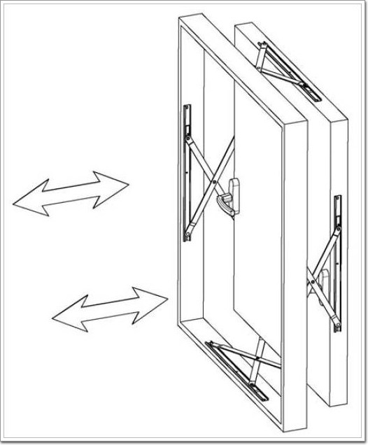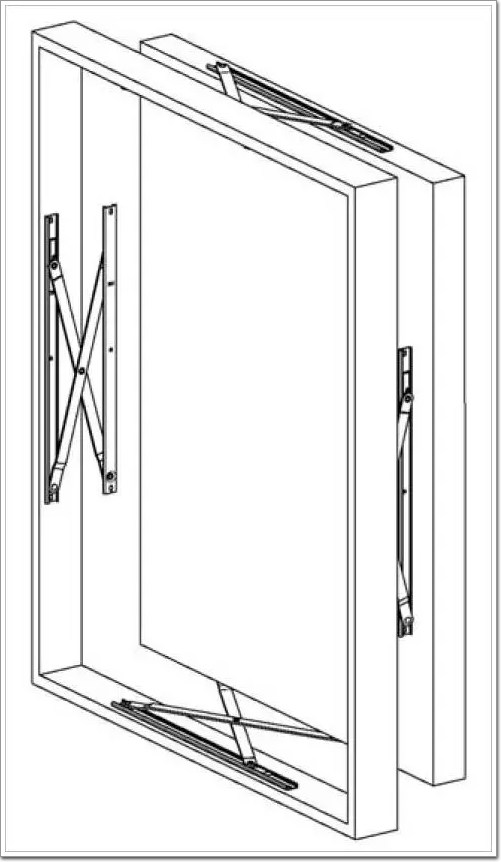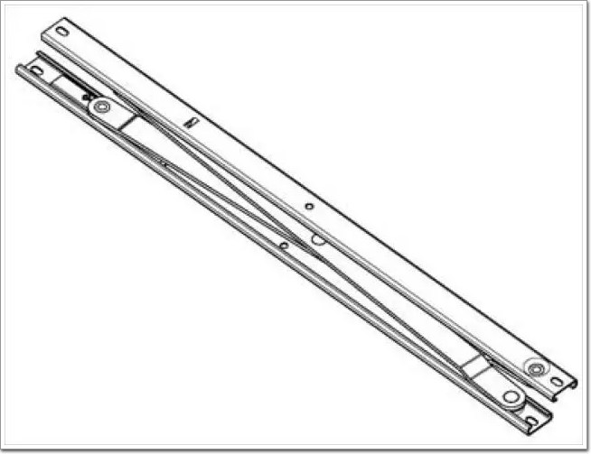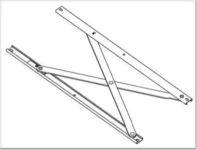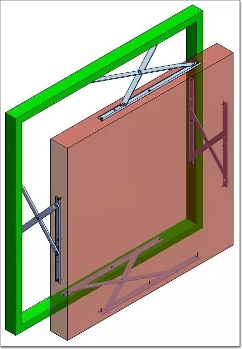 這種單 X 型平推鉸鏈安裝在窗戶的四周,當窗戶開啟的時候,窗扇將不是如合頁或摩擦鉸鏈一樣沿窗一側的單軸或多軸共同作用的軌跡轉出去,顧名思義,而是整個窗扇平移出去,如下圖: