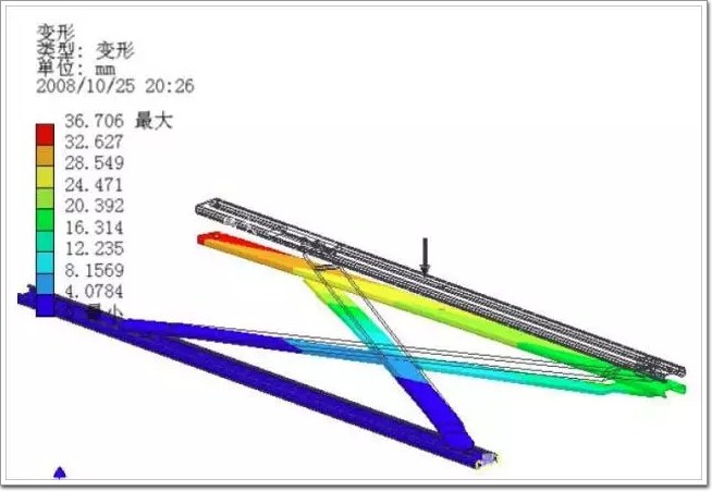 圖中顯示變形量達到36mm 之大!需要說明的是,因為所用軟件原因,筆者只能將平推鉸鏈作為一個整體零件來計算,考慮到實際五金其中各種鉚接處的縫隙及緩沖,實際變形量應該更大。有限元分析作為一種有效的輔助工作,其結果具體定量數值往往只供參考,但定性結果還是很有意義的。