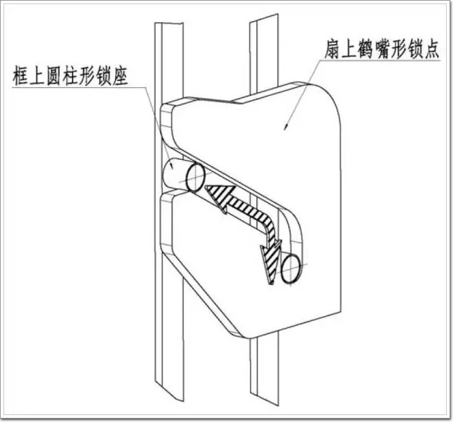 國外成熟的平推窗系統的鎖具系統要求是非常高的,實際上是完全定制的,與常規的平開五金完全不同,如下圖。這種鎖點鎖座開啟鎖閉時,扇上鶴嘴形鎖點是固定的,框上圓柱形鎖座上下移動,滑入鎖點底部,所以在此過程中開啟扇是完全不受力,不會影響其穩定性。