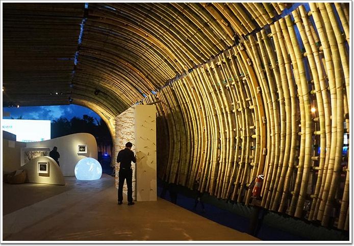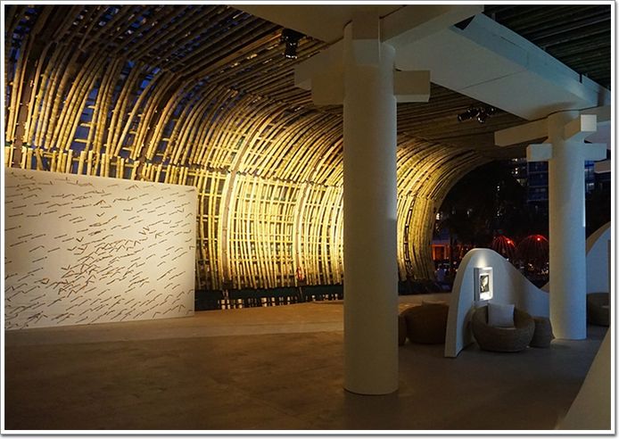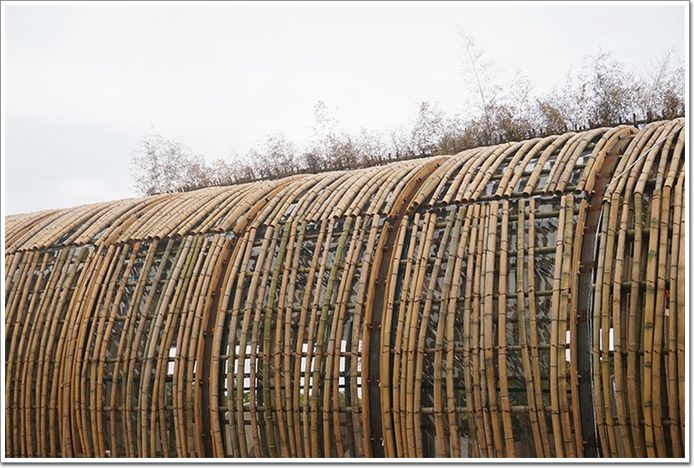 竹條地從地面向天空溫柔延伸,形成溫馨展區的屋頂