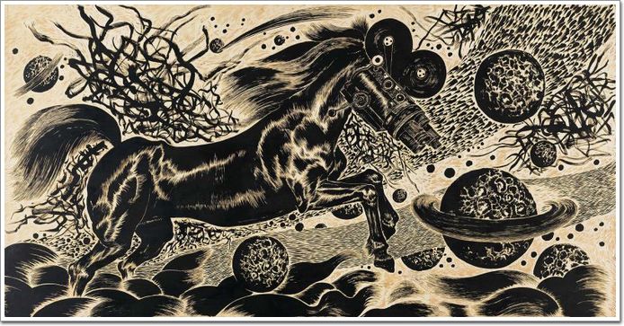 同樣作為《宇宙的重建》部分子作品進行展出的是視頻作品《時間間諜》,這是一段時長十分鐘的動畫電影,藝術家利用中國傳統圖解方法制作該段動畫視頻。藝術家目前正負責一間龐大且不斷擴大的動畫工作室,該工作室致力于實現藝術家越來越復雜的電影作品。《時間間諜》中近10000幀的畫面均由一個個單獨的手工木刻作品組成,這意味著該項目需要數以百計藝術生們的協助。動畫播放屏幕被擺放在館外,參觀者們被邀請在館外通過佩戴特制的3D眼鏡觀看3D動畫電影,值得一提的是,這些特制的3D眼鏡也同樣是藝術生們設計的。