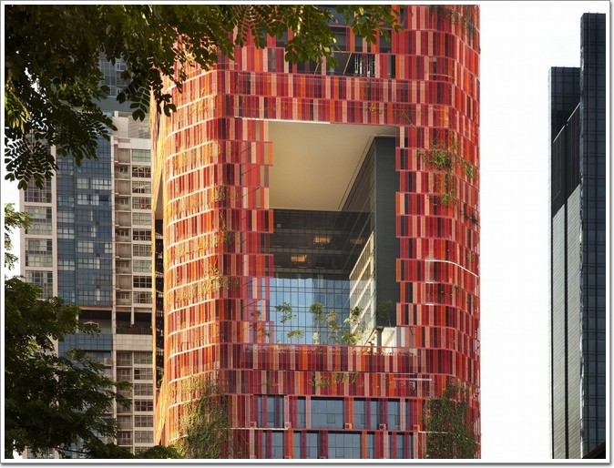 而無論室內亦或室外空間,景觀的用途被進一步擴展,成為了立面建筑材料中不可或缺的一部分。建筑整體的綠色容積率高達1100%,當仁不讓成為了鳥類與野生動物棲息繁衍的天堂,將生態多樣性帶回城市的中心地帶,同時也有效地彌補了與周邊10座建筑組成的小區域內毫無綠色空間的尷尬局面。在鮮紅的鋁制金屬網的映襯之下,攀緣植被的顯得格外青翠欲滴,五彩繽紛的花果夾雜其中,為鳥類與昆蟲提供了充沛的食物。在未來,這些植被將根據光照、隱蔽度與風力條件占據最適于其生長的空間,逐漸形成色彩、紋理相異,如馬賽克般的立面效果。而屋頂空間同樣延續了WOHA獨特的設計手法,充滿了綠意、生機與多樣性。
