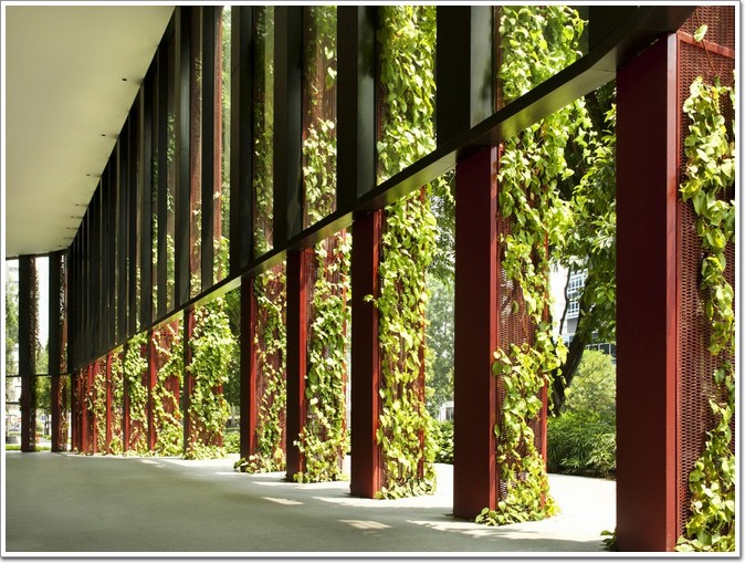 在建筑的外觀上,設計師的用心顯而易見,外立面由紅色的鋁制金屬網和玻璃幕墻混搭而成,21種攀爬植物覆蓋在酒店建筑的外立面,以形成天然的“植物幕墻”,同時也意在創造一種“毛茸茸”的視覺感受,酒店不只是一座典型的玻璃和鋼的結構體,它應該有溫度、有顏色進而影射生命。紅色、橙色、粉紅以及栗色在這棟摩天綠色中交替出現,如花朵般絢爛無比,假以時日整體外觀會隨著植物的生長而慢慢地改變,屆時你會看到松鼠在這幢建筑體上上竄下跳,從沒有一幢建筑可以這樣驕陽似火卻又綠意盎然,美得驚心動魄。