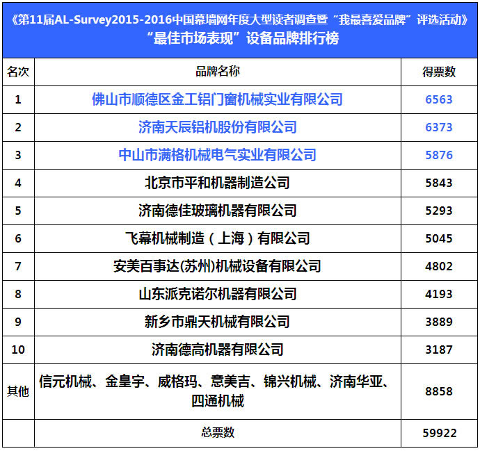 本屆“讀者調查”是該活動至創辦以來的第11屆盛會,活動于2015年9月開始入圍品牌的征集,同年的12月1日正式啟動對入圍的14項幕墻工程以及系統門窗、建筑膠、玻璃、型材(詞條“型材”由行業大百科提供)、五金配件、加工設備、隔熱材料等七大類169個品牌的網上投票,截至2016年2月25日投票結束,累計收到有效票數98311張,配合專家、媒體總編評審,最終評選出包括“我最喜愛幕墻工程、用戶選擇獎、市場表現獎、十大品牌”等四大獎項的68家獲獎企業。現將加工設備獲獎企業公布如下: