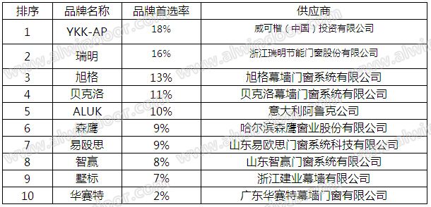 各地區幕墻企業品牌首選率前五名