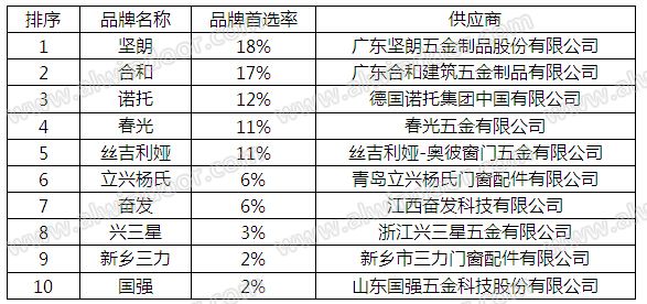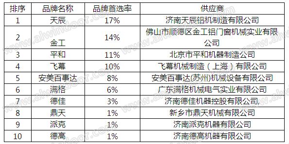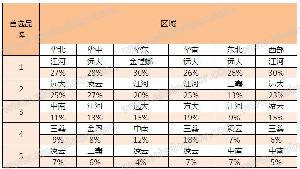從區域分布來看,沈陽遠大以多個區域的品牌首選率第一獨占鰲頭,在華中、華東、華中、東北、華南占據首位。而江河的成績也不差,以27%和30%的首選率占據華北、西部地區首位,隨著國內企業品牌影響力的提升,品牌競爭力有所提高,三鑫、凌云、金粵、方大等企業的均有不俗表現。見表 01