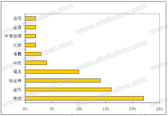 榜單顯示,作為國內最大的建筑玻璃制造企業之一的上海耀皮位居榜首,其在國內門窗幕墻行業巨大的影響力是其獲得品牌首選“狀元”的堅實基礎。接著緊跟其后的是兩大品牌信義和金剛,兩者差距微乎其微,排在第四位的是南玻,如果單單從玻璃業界來看,前三名企業的產能和產量似乎不及南玻和北玻這類國內玻璃行業巨頭,但從建筑行業用玻璃選取率分析,行業特點和特色的玻璃企業優勢明顯。而排在第五名的北玻首選率與第四名相距甚遠。除了冠軍品牌,其他品牌也大多集中在華南、華中、西部等地區。見圖04