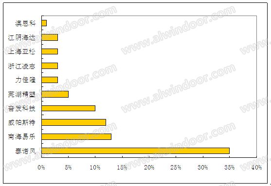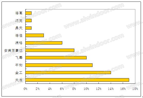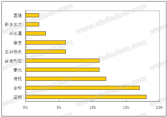 (1)由于我國是鋁型材最大的出口國,無疑榜單上不可能有海外品牌的存在,而這些國內品牌大多集中在華南和華中地區。就國內的型材企業而言,每個品牌之間首選率還是有很大的差距。而國內型材龍頭企業堅美鋁材當之無愧排一榜首,其次排在第二位的是同屬華南地區的亞鋁,位列第三和第四位的分別是偉昌和南山鋁業。重視新產品、新技術推廣的偉昌鋁業、偉業鋁業等在本次評測調查活動中品牌首選率較往年有了較大提升。除此之外,廣東豪美鋁業、鳳鋁等通過擴大國際交流與合作,正在逐步向建立民族企業國際名牌之路邁進。見圖05