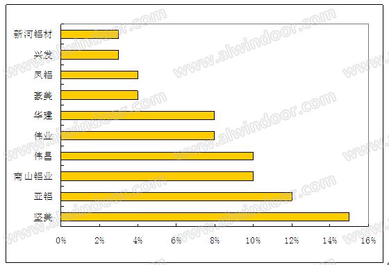 在整體市場表現,據調查結果分析,廣東堅美是市場表現最佳的企業,廣東鳳鋁和山東華建位列第二、三位。中國是最大的鋁生產國,國內有眾多知名品牌鋁業企業,市場競爭激烈。國內區域化市場分級強,往往省內區域強勢企業與外來企業的競爭中能夠占到不少的便宜,這必然導致在市場表現中強勢的企業必然是在品牌、價格以及配套的銷售網點以及更新換代產品和工藝上占有較大優勢的企業。外部市場環境因素和國內整體經濟狀況也會成為影響企業市場表現的因素之一。