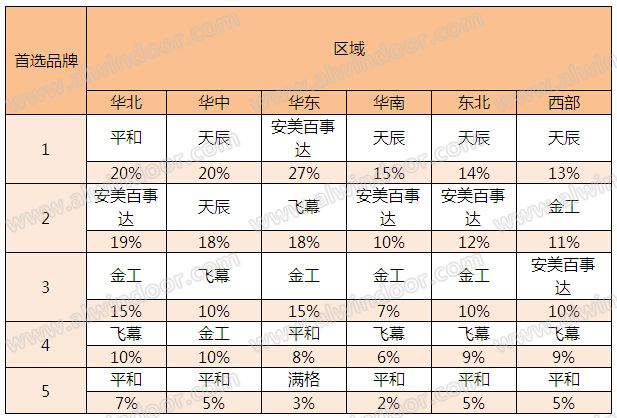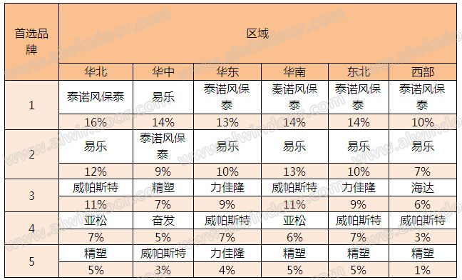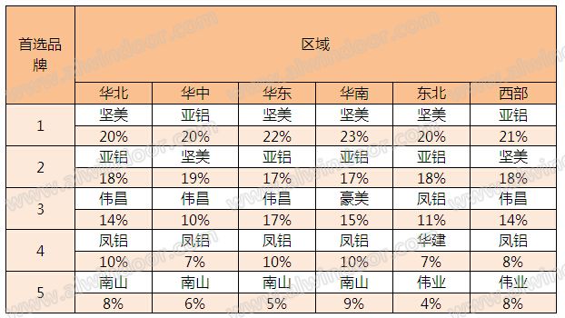 從區域分布看,前五名均被華南區域品牌所占據,,堅美分別以20%、22%、23%、20%的首選率占據華北、華東、華南、東北區域市場首位,亞鋁成績也不差分別以20%和21%的成績據占據華中、西部兩個區域首位,華建、鳳鋁等品牌也有不錯的表現。見表05