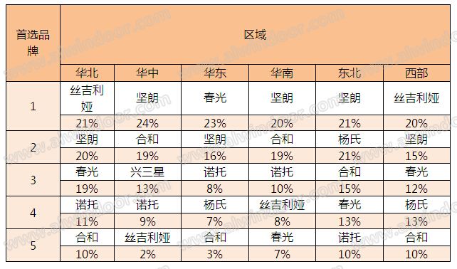從區域分布來看, 國外品牌區域綜合排名領先,堅朗五金在華中、華南、東北區域表現突出,分別以24%、20%、21%、的成績排在首選率第一位,絲吉利婭不甘示弱,同樣以華北、西部三個區域排名首位,春光五金在華東地區贏得了23%的品牌首選率。而諾托和合和雖然答題在各區域的品牌首選率三、四間徘徊,但其均衡發展的品牌效應亦為其整體品牌首選率提供強力支撐。見表06