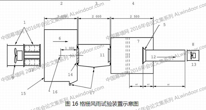 如圖16所示,裝置包括:1、風力模擬設備,2、天氣模擬倉,3、采集區(qū),4、氣動力測量區(qū),5、錐形入口測量裝置,6、進氣方向,7、阻力網,8、機械通風裝置,9、風扇,10、氣流矯直裝置,11、擋水板,12、排氣方向,13、通風機,14、測試件,15、室外空氣接觸面,16、風速測量裝置位置,17、排水口。