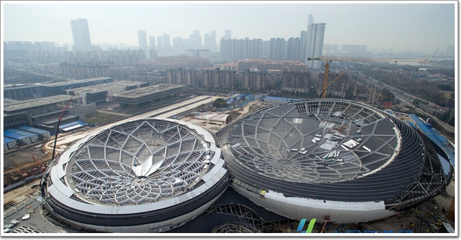 作為規模僅次于國家大劇院的江蘇大劇院自開建以來已將近3年時間,如今建設情況如何,一直倍受業界關注。昨日,無人機升空拍下諜照,大劇院“荷葉”托起四顆“水滴”的造型已經呈現出來,“荷葉”部分從“水滴”中央延伸到地面。“荷葉”的上面,四顆“水滴”在陽光下熠熠生輝,而這四顆“水滴”分別是音樂廳、戲劇廳、歌劇廳和綜藝廳,從照片上可以看出,整體建筑90%的外幕墻已安裝完畢;據了解,主體部分今年6月就能投入使用,9月將全部完工。