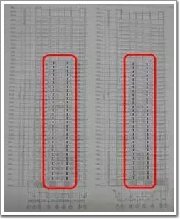 2、內筒與外圈均為PC框架(詞條“框架”由行業大百科提供)(PC柱、PC梁)。在內筒內側有一榀鋼框架(見圖示),由鋼柱鋼梁建造(僅作為機械升降停車庫,基本不作為抗側力體系)。