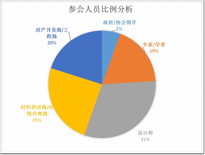 參會人數達到2037人,其中政府部門/協會領導占總人數5.5%;建筑及建材行業領域專家、學者占總人數18.5%;設計師占總人數31.4%;材料供應商/經銷代理商占24.5%;房產開發商/工程商占總人數20.1%