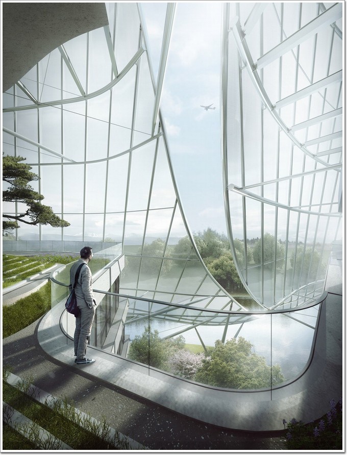 作為一個創新型的辦公建筑,其空間組織結構如同圍繞中心點展開的六個花瓣,使得集團六大品牌既有自己獨立的辦公研發空間,又可以與其它部門相互交流。有別于常見的方盒子建筑,發散型布局使得辦公空間靈活高效,并具有足夠的自然光線,通風和景觀。作為公共區域有中庭,向不同品牌的員工、客人開放,其間的天橋除作為空中的交通連接外,還可以用作時裝秀等表演空間。設立于中庭的兩個景觀電梯又將半透的辦公中廳空間在豎向上連接在一起。內部與外部環境連接,將研發中心的公共交流從室內延伸到室外花園,為員工提供輕松的氛圍和場所,同時具有很強的向心力。