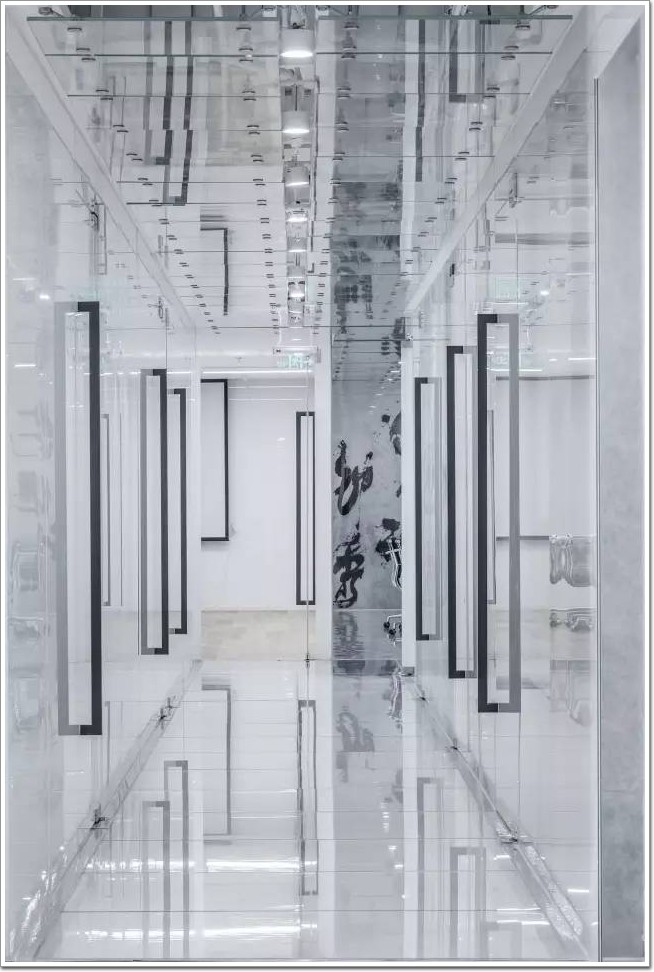 當突出宣紙玻璃的時候,原來的園林的布局被重新組織到不同的平行世界,而在視覺上則抽象到毫無辨識度,只剩下暗示性的材料比如鏡子和木材證明這個空間在最初設計上的意圖,水面,天空,或者亭臺樓閣。不過回過頭來看,這種極致的抽象化非常有趣,它們消融在宣紙玻璃所制造的重屏中,但因為它們的原型的差異,它們在重屏上的剪影還是有差異的,這些細微的差異制造了重屏平行世界在視覺和體驗上的豐富性,這就是極簡主義中式和極簡主義的差異吧。