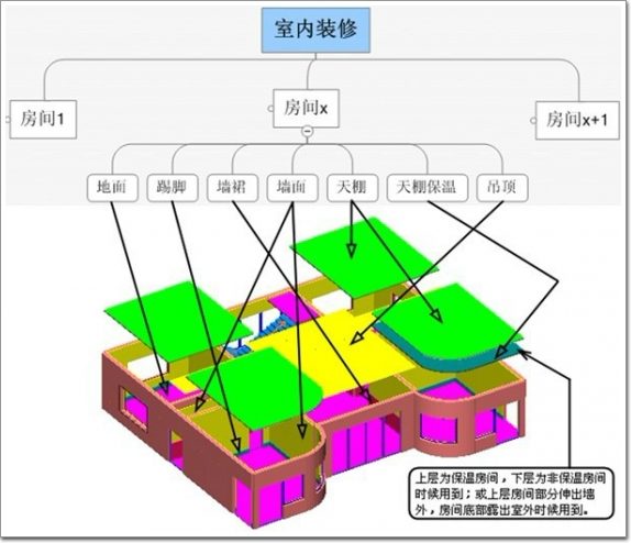 (五)首層室內裝修包含哪些構件:首層室內裝修需要先分房間,再把每個房間分成各個構件,每個房間包含的構件可能有:地面、踢腳、墻裙、墻面、天棚、吊頂等,見圖3.14