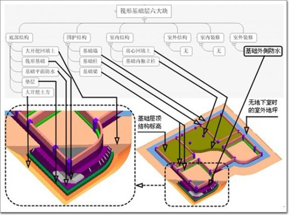 (一)基礎層構件類別 基礎層我們仍然按照六大塊的原理進行分解,只是把頂部結構換成了底部結構,根據基礎類型不同分為筏形基礎、條形基礎、獨立基礎、樁承臺基礎。