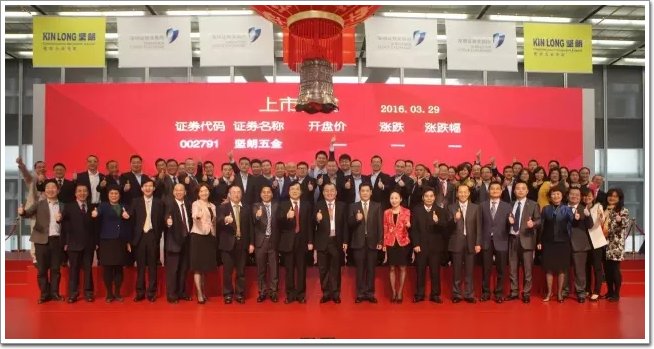 2016年,是廣東堅朗五金制品股份有限公司發展里程碑上重要的一年。3月29日,堅朗公司在深圳證券交易所中小板掛牌上市,成為目前國內第一家大型建筑五金上市公司(詞條“上市公司”由行業大百科提供)。A股上市,意味著堅朗五金邁開了在資本市場的第一步,為公司融資開辟了新渠道,目前堅朗五金的市值已經超過了110億,公司將向著更高的方向發展!