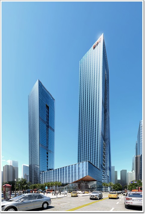 建筑特色:塔樓的設計按照一個合理的進深及實用率設計,呈現出一個方形平面,在陽光充沛的深圳,東西側的辦公空間受日照光線的直射比較嚴重,于是東西側凹槽的處理成了一種應對環境的結果,而塔樓南北側的相互錯動,并將塔樓的兩條“腿”與裙房做連接,形成一個循環的有機整體,其形態意向是兩位舞者歡快的探戈舞步的姿態,設計打破了塔樓與裙房呆板的關系。