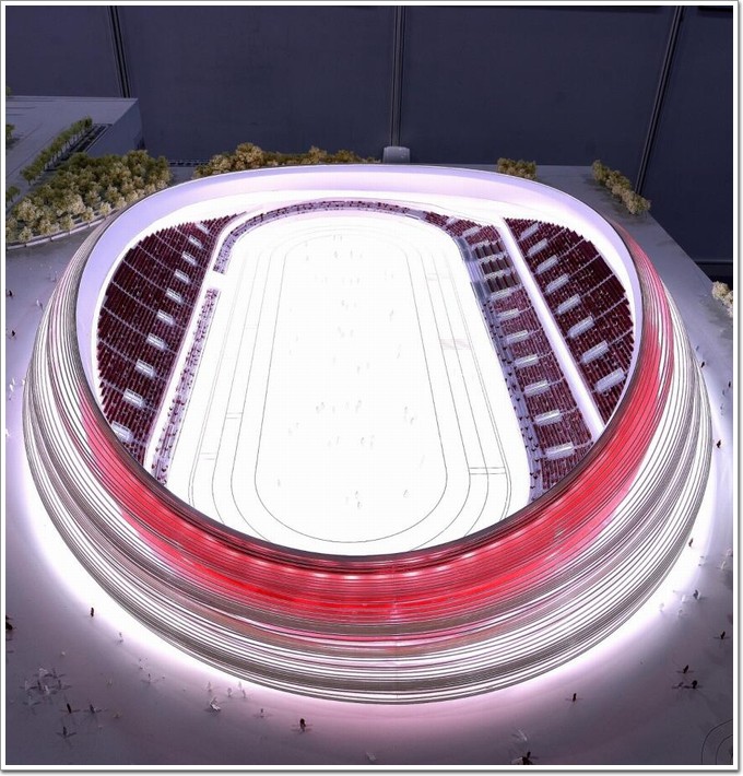 速滑館設計整體為橢圓形,平面尺寸為220M*160M,“馬鞍”造型主要與賽道要求有關,國際滑聯規定的標準400米速滑賽道、人工制冰的冰面以及標準速滑賽道兩端各需要有180度弧等相關要求,在場館設計方案中均得到很好落實。在建筑外圍將有22條銀白色玻璃幕墻絲帶,一圈圈如銀河如冰鏈,“冰絲帶”的控制高度為55米,每圈長度600米,上下疊合,且每圈玻璃絲帶都是曲面玻璃,內裝LED燈光,形成獨特的冰上體育建筑外觀,22條“冰絲帶”看上去交織成繭,象征著2022年奧運之星將從此破繭而出,寓意非凡。