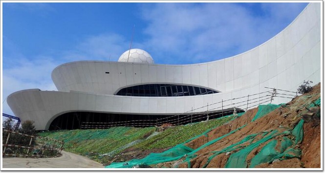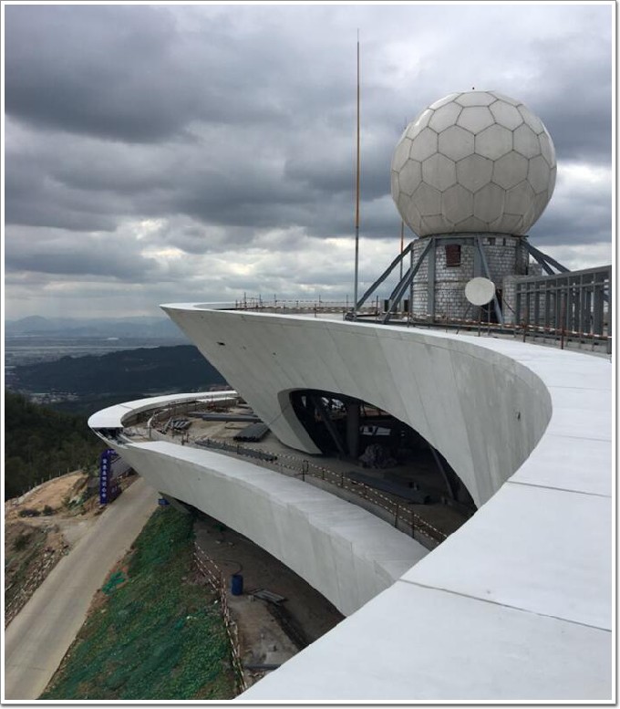 項目在初步計算過程中發現,由于項目位于沿海山峰頂部,廈門基本風壓本來就較大,在考慮地形條件的修正系數后,邊角區風荷載(詞條“風荷載”由行業大百科提供)標準值達到7kN/m2;方案要求盡量采用大分格、大板塊,都給面板材料選擇帶來了巨大的挑戰。面板材料選擇在對方案及模型進行仔細分析研究后,幕墻設計最終確定為選取大量雙曲面板,而且必須保證雙曲板的連續順滑過渡,才能實現方案的建筑效果。表面由白色玻璃鋼拼接而成,緊緊包裹著重達10噸的新一代多普勒雷達核心設備。