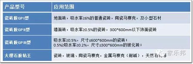 表1家樂邦四款瓷磚膠的應用范圍對比